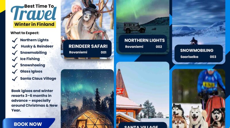 - Lapland: Meet Santa Claus in Rovaniemi, go on husky and reindeer safaris, and stay in glass igloos.